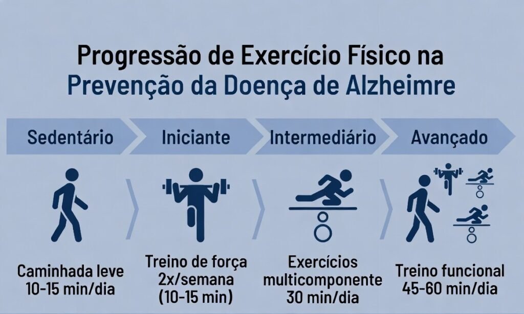Essa progressão respeita o condicionamento atual e minimiza riscos, tornando o exercício sustentável e eficaz na prevenção e no controle da doença de Alzheimer.