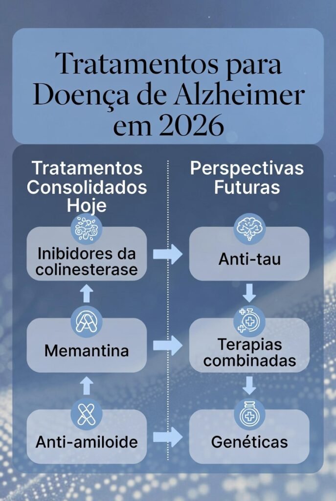 • Os tratamentos para a doença de Alzheimer evoluíram de forma notável nos últimos anos. Em 2026, já não se fala apenas em controlar sintomas, mas em modificar o curso da doença. Embora ainda não exista uma cura, as opções disponíveis e as pesquisas em andamento criam um horizonte de possibilidades concretas, permitindo que famílias planejem o futuro com mais tranquilidade e esperança.